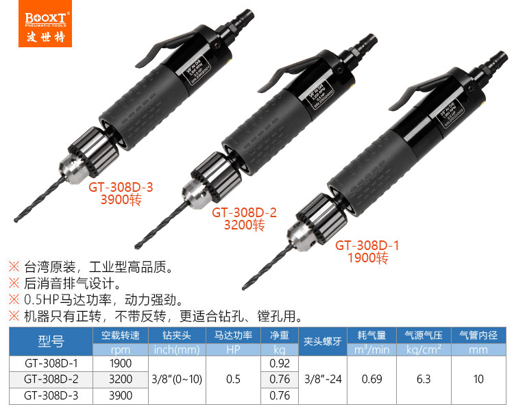 東莞市強勁五金工具有限公司提供臺灣BOOXT波世特品牌氣動工具,直式風(fēng)鉆GT-308D-3廠家直銷,首件享特價。咨詢熱線:4008301980